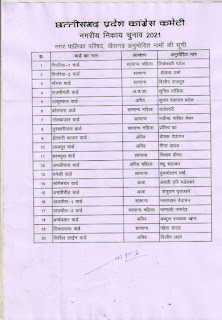 रायपुर। कांग्रेस की प्रदेश निर्वाचन समिति ने आसन्न नगरीय निकाय चुनाव के नगर पालिका परिषद खैरागढ़, नगर पालिका परिषद जामुल, नगर पंचायत भैरमग...
